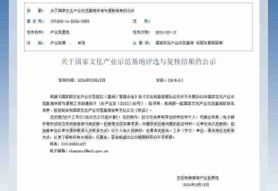 新一批国家文化产业示范基地公示,,,1win成功入围